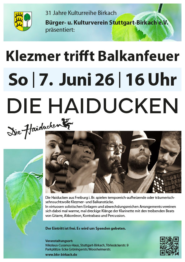 Die Haiducken aus Freiburg i. Br. spielen temporeich-aufheizende oder träumerisch-sehnsuchtsvolle Klezmer- und Balkanstücke.